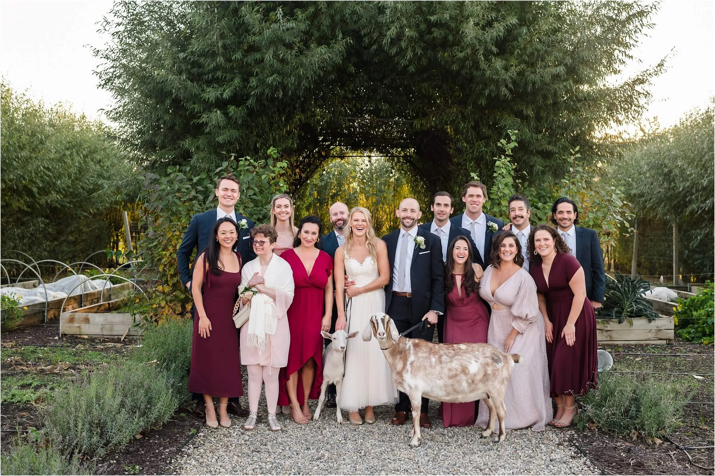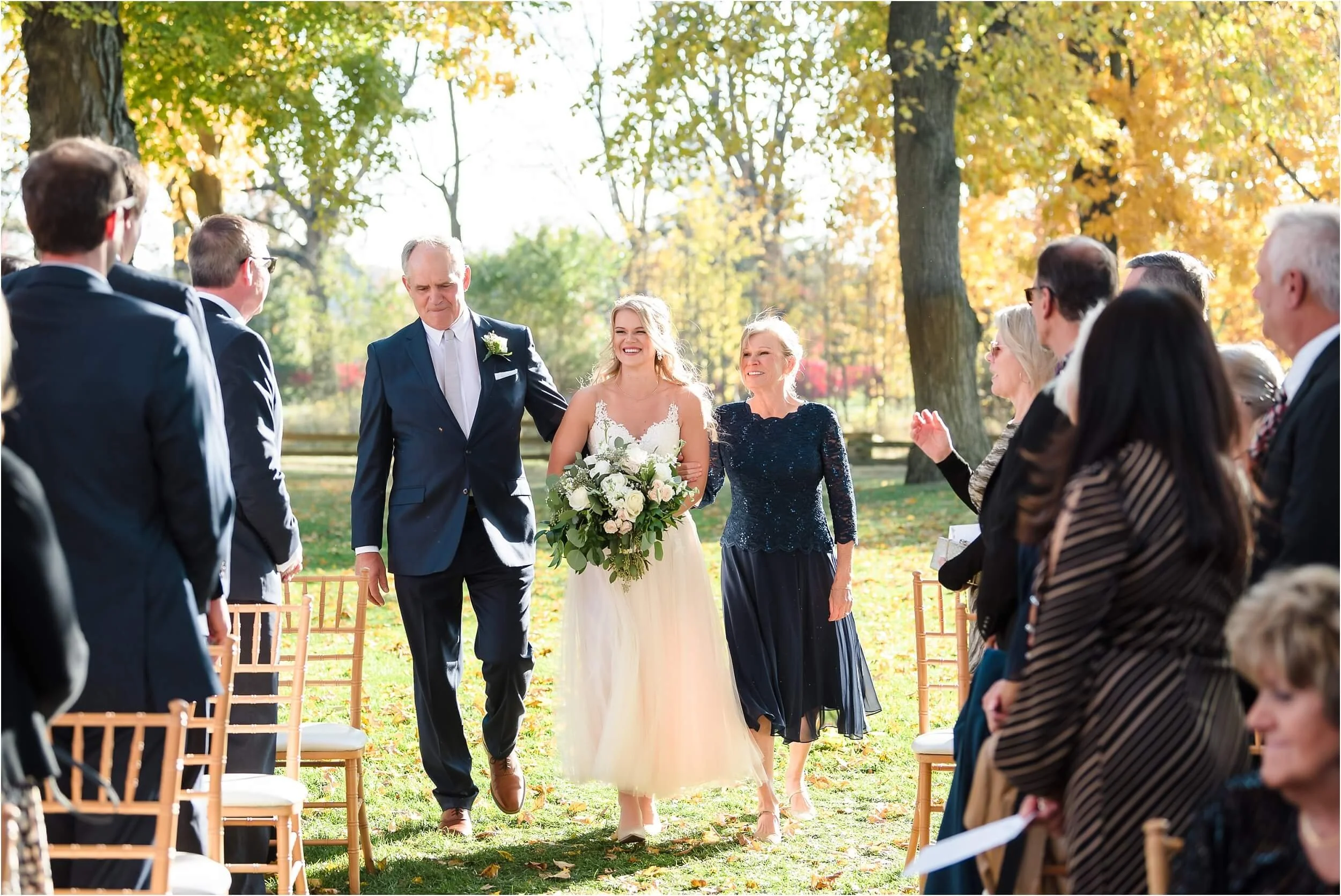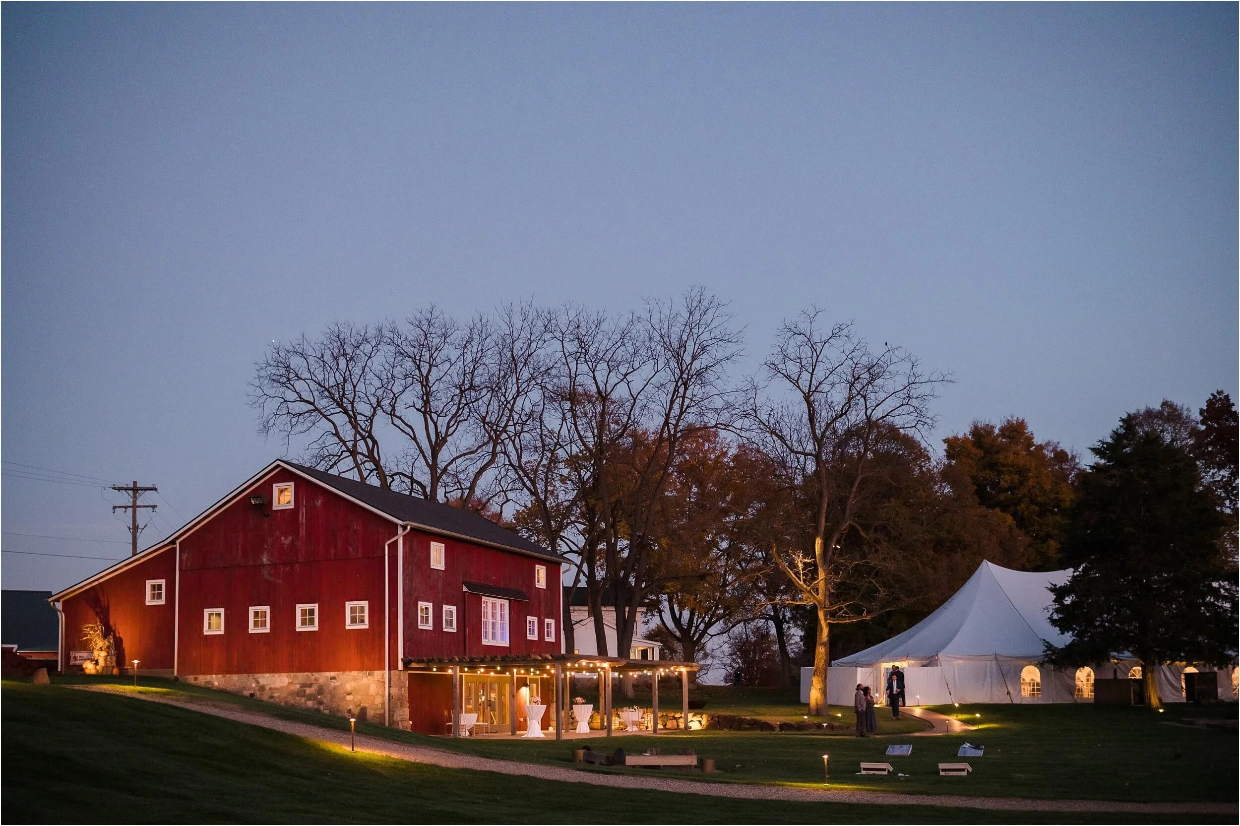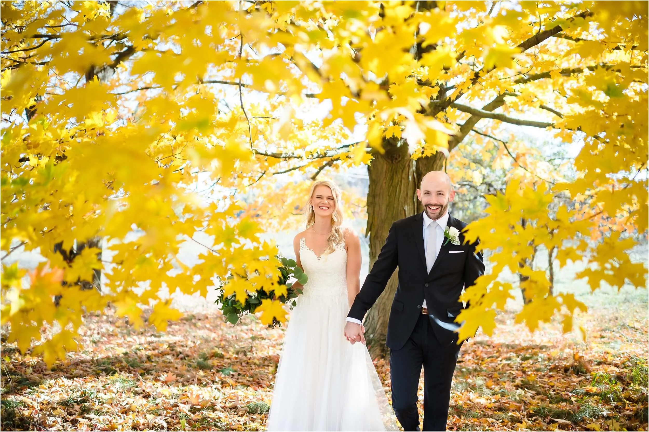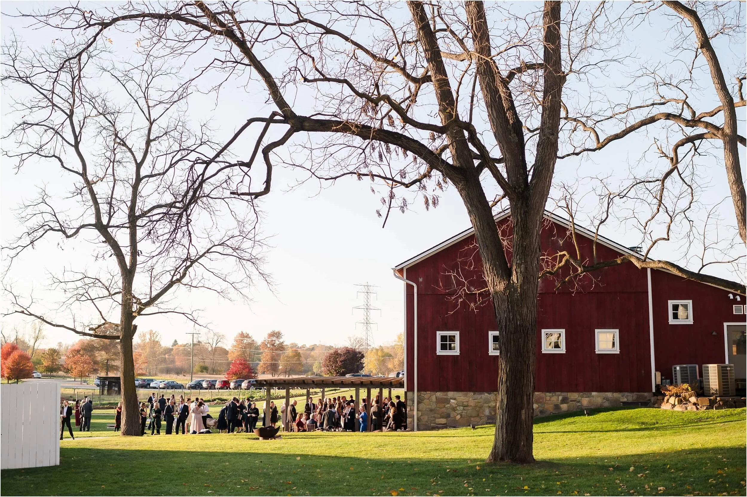 Fall really turned up the charm for this wedding at a gorgeous farmhouse wedding venue near Ann Arbor. M & N’s vows were seriously sweet, and it felt like the whole wedding was strictly about celebrating their love and spending time with the people they cared about most. Following the ceremony, guests were hanging out under the pergola, soaking in that crisp fall air, when – wouldn’t you know it? – a bunch of friendly goats decided to crash the cocktail hour for some extra photo ops and cuddles! As the sun set, a bonfire got crackling, and everyone gathered around to roast marshmallows, swap stories, and gaze up at the stars. As a Ann Arbor wedding photographer, I think barn weddings are the best, and they’re typically some of my favorite venues to photograph at. They’re so full of history and charm, and have that cozy vibe, which is perfect for a fall wedding. Plus, they usually have plenty of space indoors in case of rain (because Michigan weather can be a wild card!). For suggestions on some of my favorite venues in the area, check out this blog post.