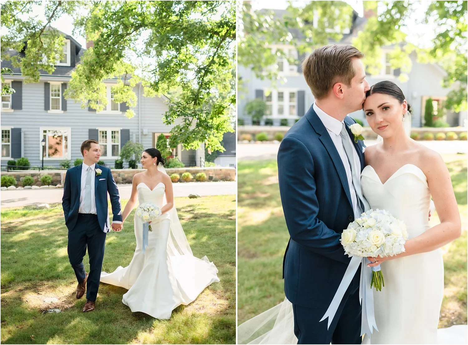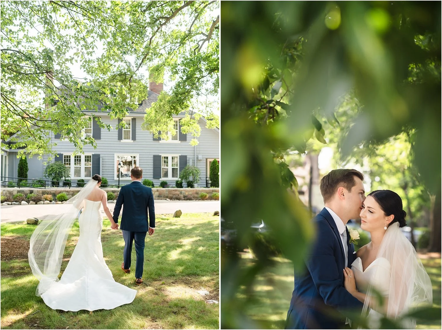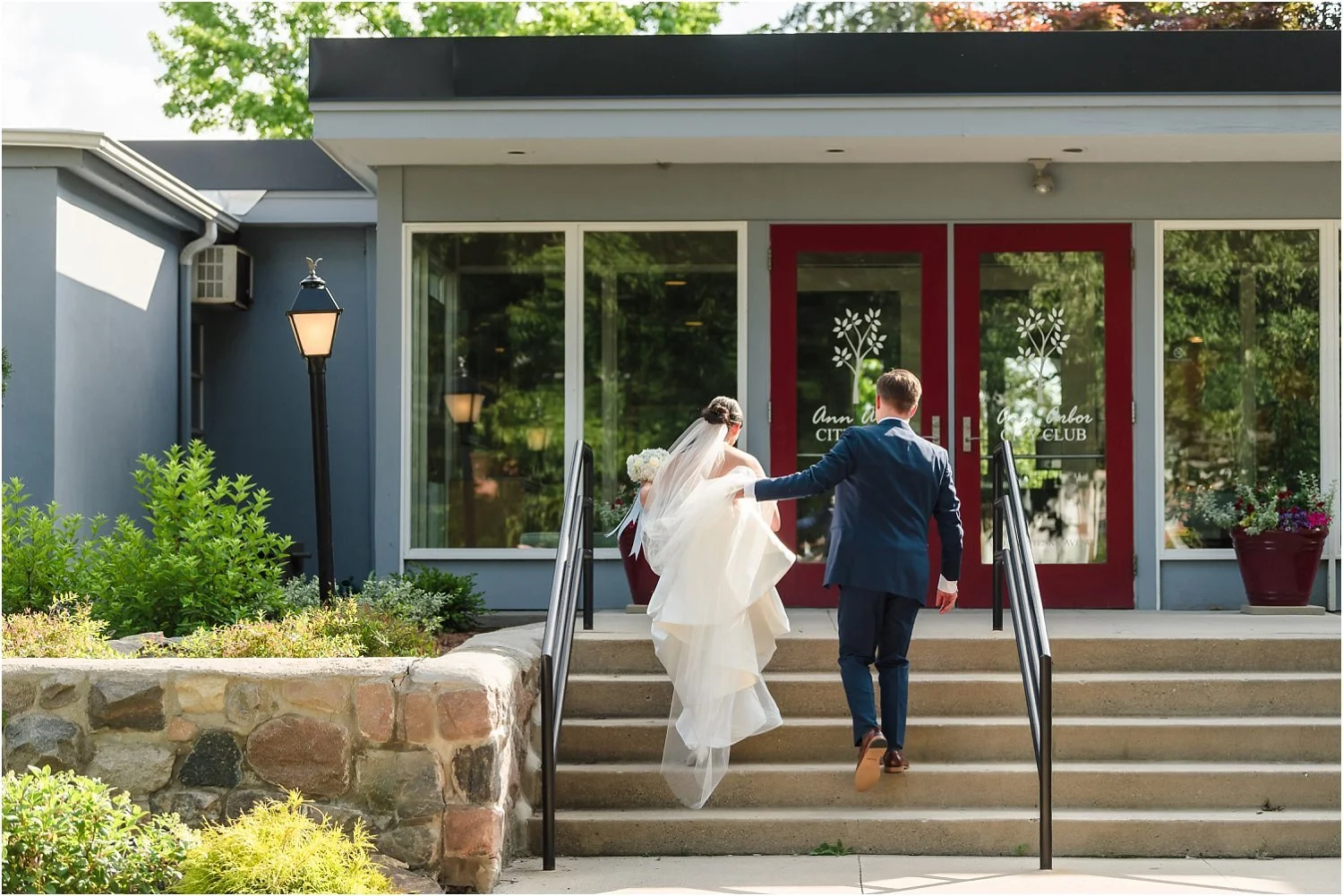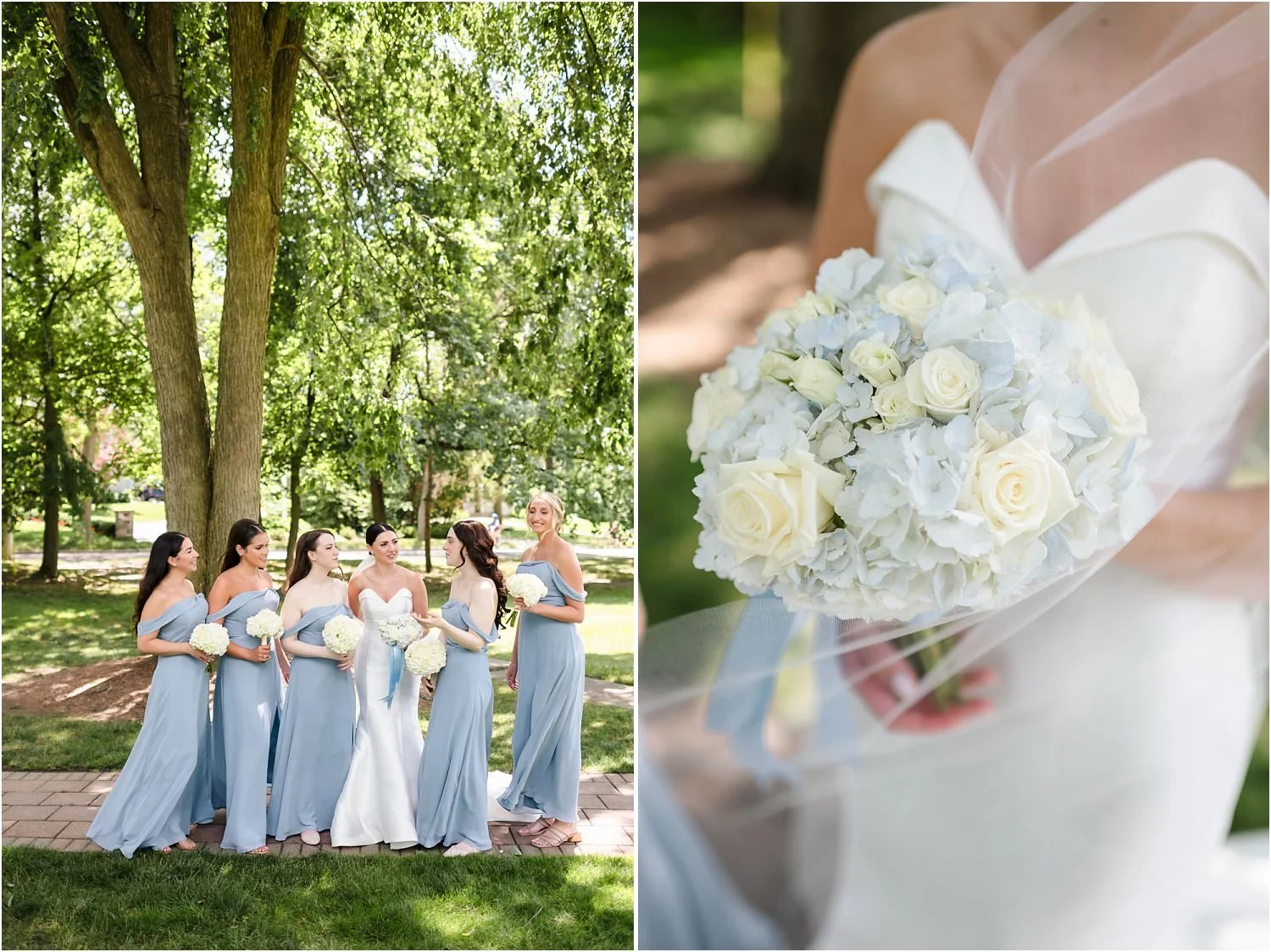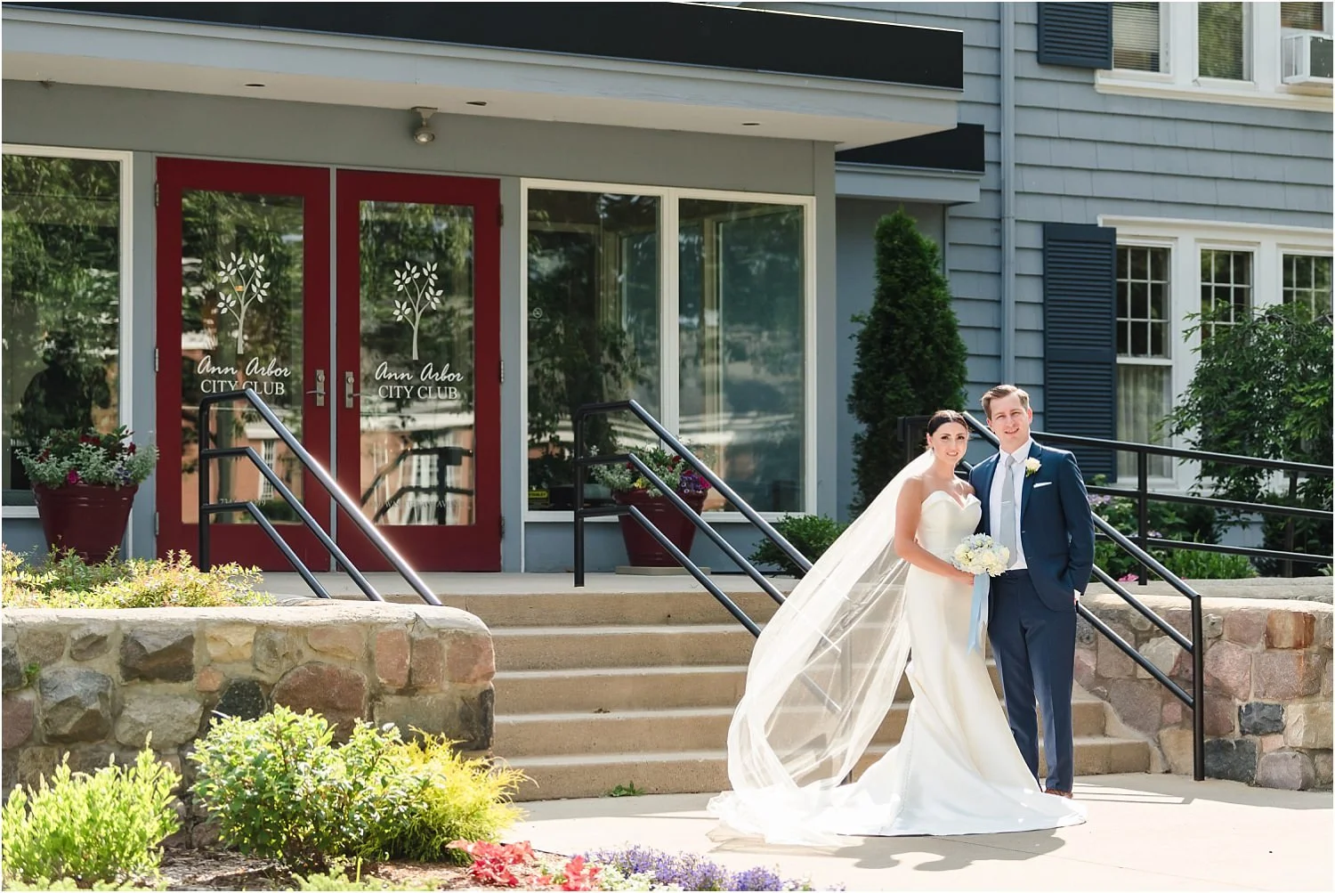 Talk about a picture-perfect summer wedding! The Ann Arbor City Club looked like it was straight out of a fairytale with the sun streaming through the trees at the ceremony. T totally stole the show with her fitted modern gown and her cathedral veil – it was an amazing contrast to this historic venue. T & D also chose a perfect color scheme, blue, blush, and white, and it matched the exterior of the building perfectly. I love little touches like that- thoughtful details really make each wedding so unique. As a Ann Arbor wedding photographer, this is probably my favorite venue in Ann Arbor proper just due to it’s historic charm and proximity to campus.